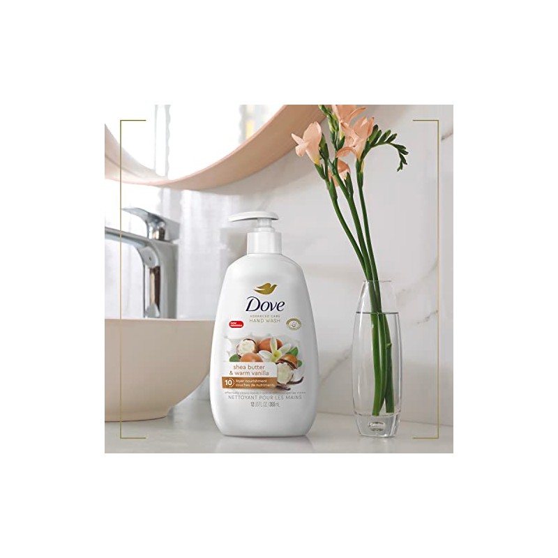 Nourish your skin and uplift your senses with Dove Advanced Care Shea Butter & Warm Vanilla Hand Wash. Infused with our unique blend of moisturizers and skin-natural nutrients, this hand wash nourishes skin 10 layers deep, so even knuckles, cuticles, and palms are moisturized. Our Advanced Care formula effectively washes away dirt and germs, while moisturizing hands for hours. Plus, this hydrating hand wash is sulfate-free and paraben-free and uses 100% recycled plastic bottles. Dove care goes further than just cleansing your hands. Dove is a dermatologist recommended brand that is as mild as water and made with gentle cleansers. Also, our Advanced Care hand wash is vegan, and Dove is PETA Approved, meaning we do not test on animals, anywhere in the world. How to use: Add a generous pump of this hand wash to wet hands. Rub your hands together to work the product into a lather, before rinsing with water. Always wash for at least 20 seconds. At Dove, our vision is of a world where beauty is a source of confidence, and not anxiety. So, we are on a mission to help the next generation of women develop a positive relationship with the way they lookreaching over of a billion young people with self-esteem education by 2030. We are also committed to a landmark new initiative as part of our 2025 commitment to reduce plastic waste; reducing over 20,500 metric tons of virgin plastic annually by making the iconic beauty bar packaging plastic-free globally; launching new 100% recycled plastic bottles; and trialing a new refillable deodorant format. As one of the largest beauty brands in the world, we are revealing an agenda-setting commitment to tackle the global beauty industrys plastic waste issue. More moisturizers vs the leading hand soap variant based on 2021 unit sales of non-antibacterial liquid hand soaps.