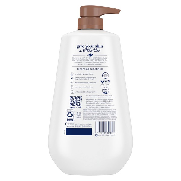 Your skin works hard taking care you every day - it's time to return the favor. (Cue skin silently saying yes!) Bring it back to life with our rich and creamy Dove Restoring Coconut & Cocoa Butter Body Wash. Millions of hard-working 24hr Renewing MicroMoisture droplets that are specifically designed to absorb deeply and work with your skin's natural renewal process will help retain and boost moisture. While skin-natural nourishers and skin-loving plant-based moisturizers give you gently cleansed, nourished, healthy-looking skin that stays that way all day. Restored, rebooted, renewed. And rewarded! With a creamy coconut fragrance highlighted by soothing vanilla, decadent cacao, and fresh almonds that'll have you going loco for coco(a) twice over. To use this rich, creamy body wash, squeeze into palms or loofah, massage into skin, give it a little love, let the lather soak in, rinse and step out of shower feeling restored and silky-smooth-like-butter all over. Who else would you trust, but the dermatologist-recommended brand (us!) to deliver a long-lasting, nourishing body wash? Our Restoring Coconut & Cocoa Butter Body Wash is vegan and Dove is PETA approved, meaning we do not test on animals anywhere in the world. Plus, it's sulfate-free, paraben-free, and packaged in 100% recycled bottles.