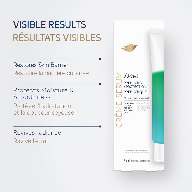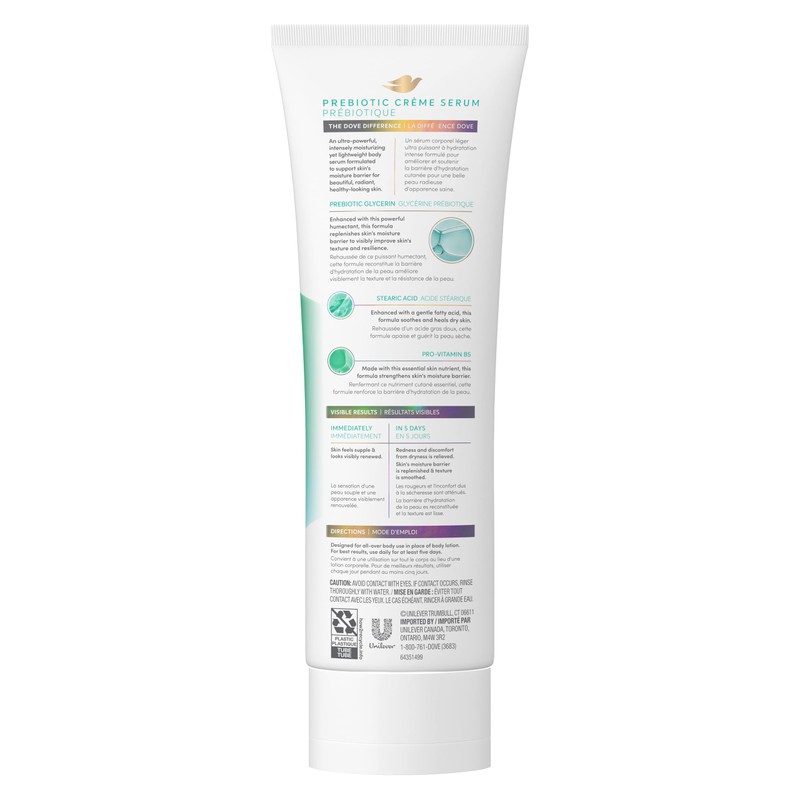 Dove Prebiotic + Protection Crme Body Serum is a non-greasy, fast-absorbing, lightweight, all-over body serum that delivers next-level skin care that goes beyond moisturization. This high-potency body serum is made with face care ingredients and supports skin's natural surface renewal process for visible results: renews the skins moisture barrier, relieves redness & discomfort from dryness and smooths skin texture for visibly healthy, radiant skin. Our individual skin needs are unique and varied, requiring tailored solutions to effectively address skin concerns. Visible skin health and radiance can be compromised by various factors leading to skin having an unbalanced moisture barrier, redness & discomfort from dryness, dullness, or sensitivity. Dove Crme Serums were developed with dermatologists with the purpose of bringing the potency and efficacy of face serums into body care. This body serum is a science-backed formula that delivers 72-hour moisture, is clinically proven for dry skin, and is made with face care ingredients: Prebiotic Glycerin, Pro-Vitamin B5, Stearic Acid, and Peptides. Dove Crme Body Serums are clinically tested to ensure safety and efficacy across all skin types. This formula is designed for all-over, daily use in place of body lotion and has a velvety application tested and loved by real women. Other skin needs or concerns? Explore our full range of Dove Crme Body Serums - all developed with dermatologists, designed for all skin types and tones, and proven for visible results.