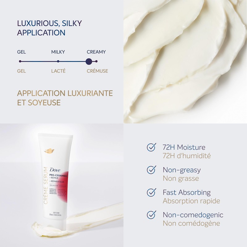 Dove Pro-Ceramide + Repair Crme Body Serum is a non-greasy, fast-absorbing, lightweight, all-over body serum that delivers next-level skin care that goes beyond moisturization. This high-potency body serum is made with face care ingredients and supports skin's natural surface renewal for visible results: renews rough, flaky skin, relieves redness & discomfort from dryness, soothes dry skin, and softens for visibly healthy, radiant skin with a dewy finish. Our individual skin needs are unique and varied, requiring tailored solutions to effectively address skin concerns. Visible skin health and radiance can be affected by various factors leading to skin having a compromised moisture barrier, dullness and redness from dryness. Dove Crme Body Serums were developed with dermatologists with the purpose of bringing the potency and efficacy of face serums into body care. This body serum is a science-backed formula that delivers 72-hour moisture, is clinically proven to renew rough, extremely dry skin, and is made with face care ingredients: Pro-Ceramides, Hyaluronic Acid, Niacinamide, and Natural Moisturizing Factors. Dove Crme Body Serums are clinically tested to ensure safety and efficacy across all skin types. This is rigorously tested to ensure suitability for sensitive skin. Our formula is designed for all-over, daily use in place of body lotion or body moisturizers and has a velvety application tested and loved by real women. Other skin needs or concerns? Explore our full range of Dove Crme Body Serums - all developed with dermatologists, designed for all skin types and tones, and proven for visible results