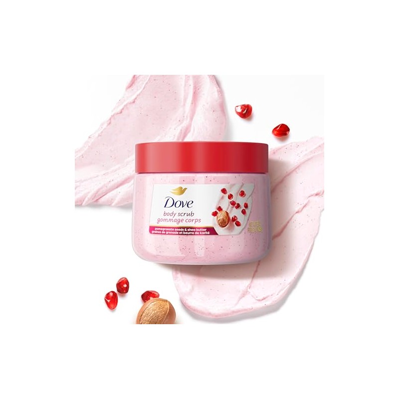 There's one essential step for achieving smooth skin that shouldn't be overlooked: exfoliation. So, gently buff away dry, dull skin while caring for your skin with Dove Pomegranate Seeds & Shea Butter Exfoliating Body Scrub. Made with moisturizing cream, this exfoliating body scrub restores skin's nutrients as it exfoliates, leaving your skin feeling silky smooth. With a smooth, easily spreadable texture, this Dove body exfoliator gives you beautifully creamy coverage while releasing the sweet scent of pomegranate. Get all the effectiveness you'd look for in exfoliators or a shower scrub, but with the nourishment and care that your skin needs in the shower. To use, scoop a generous amount of Dove Pomegranate Seed & Shea Butter Exfoliating Body Scrub out of the jar. Massage all over your body in circular motions for creamy coverage, and then rinse away to reveal silky smooth skin. Use 3-4 times per week as part of your skin care regimen, followed by Dove Body Wash or Beauty Bar for touchably soft skin. Try Dove Body Scrub to get beach-ready skin, prep skin for tanning, or to help exfoliate before shaving to help prevent ingrown hairs. You'll love the feeling of silky smooth skin all over. Plus, when you buy Dove, you can be assured you're caring for your skin with products that are PETA Cruelty-Free certified. Company-wide, we're also on a mission to help the next generation of women develop a positive relationship with the way they look?eaching over a billion young people with self-esteem education by 2030. We're also committed to substantially reducing plastic waste by 2025. This includes reducing our use of virgin plastic by 20,500 metric tons annually, launching new 100% recycled plastic bottles and trialing new refillable formats for certain select products.