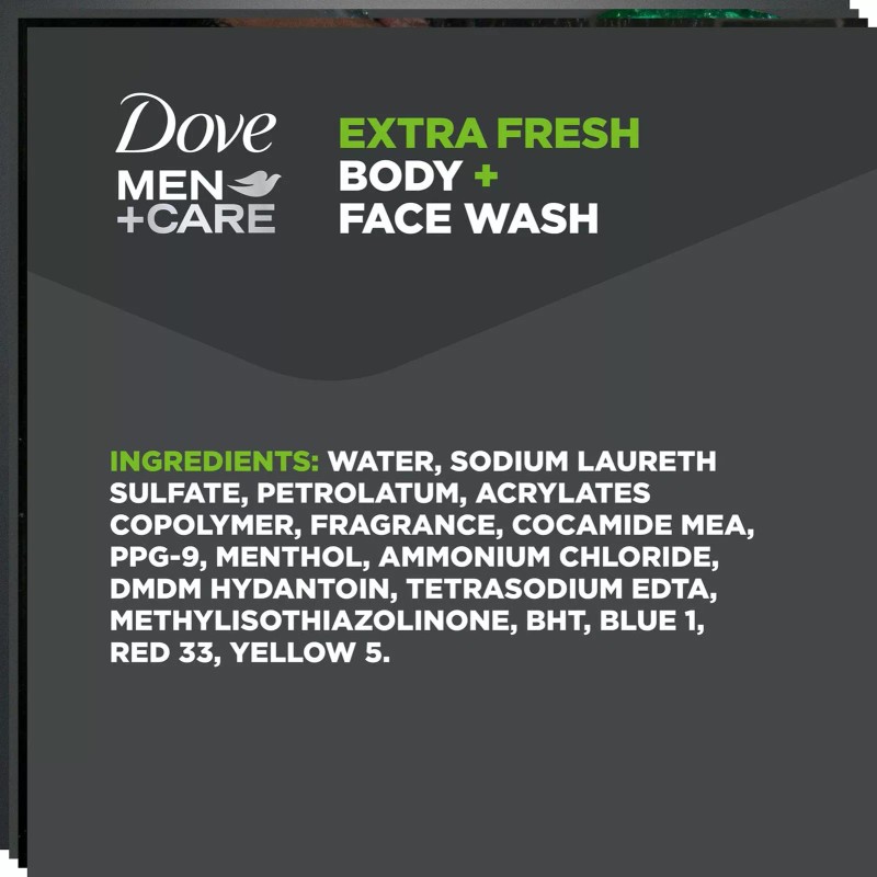 Looking for a body wash for men that leaves skin feeling fresh and hydrated? Add Dove Men+Care Extra Fresh Body and Face Wash to your shower and skin care routine! This body wash for men is specifically designed for mens skin by the #1 dermatologist recommended mens brand. Dove Men+Care Extra Fresh Body and Face Wash Pump uses its unique MICROMOISTURE technology that activates as you lather the lightweight gel to help hydrate skin and protect it against dryness. Dove Men+Care Body and Face Wash is an easy-to-rinse, hydrating body wash that is clinically proven to fight dry skin better than a regular mens body soap or shower gel. It is also gentle enough to use as a mens face wash. Extra Fresh has a clean, crisp scent that will leave you feeling fresh. For best use, pump Dove Men+Care Body and Face Wash on to your palm and rub your hands together to work the shower gel into a light foam to activate the MICROMOISTURE technology. Apply to your body and face. Rinse thoroughly. Dove Men+Care is committed to expanding opportunities for men to experience the transformative effects of care on themselves and others. As part of this, we are championing active fatherhood and paternity leave for dads everywhere, so that more dads can be there from day one. Because when men care, everyone benefits. And as part of our commitment towards sustainability, each Dove Men+Care body and face wash bottle is recyclable and made with 100% recycled plastic, and is PETA certified Cruelty Free.
