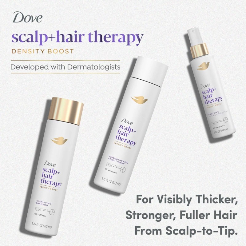 - DOVE SHAMPOO AND CONDITIONER + ROOT LIFT SPRAY: Enriched with Vitamins B3 & E, zinc, and peptides, the Dove Scalp + Hair Therapy bundle cares for your scalp, nourishes the roots, and reinforces hair fibers for stronger, healthier hair.