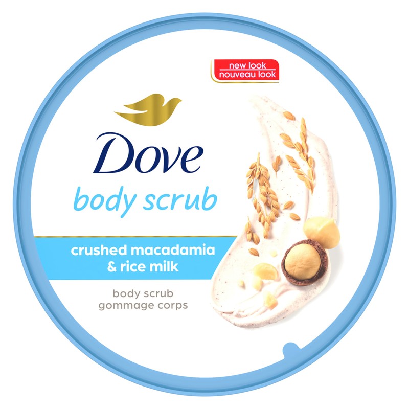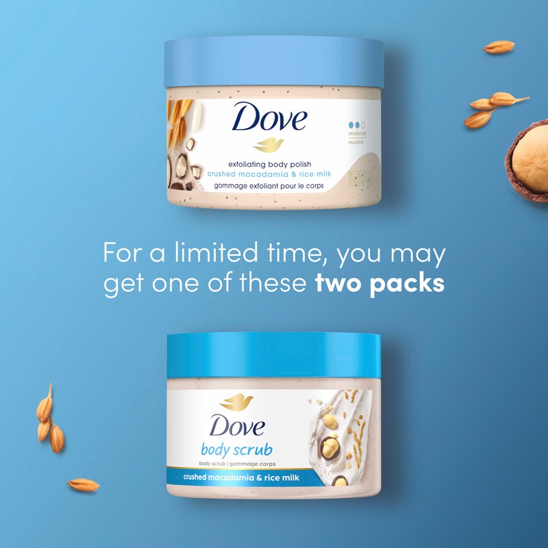 - MODERATE EXFOLIATION - Made with medium-sized exfoliating particles, Dove Exfoliating Body Polish Macadamia and Rice Milk is smooth and easily spreadable with a mild lather.