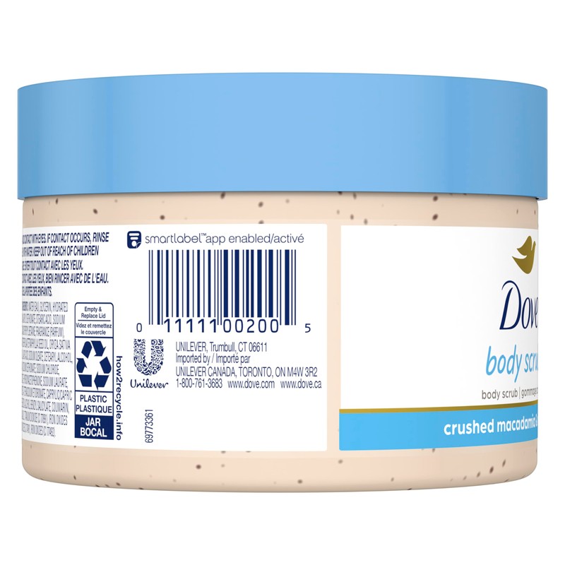There’s one essential step for achieving smooth skin that shouldn’t be overlooked: exfoliation. So, gently buff away dry, dull skin while caring for your skin with Dove Macadamia and Rice Milk Exfoliating Body Polish. Made with ¼ moisturizing cream, this gentle exfoliating body scrub restores skin’s nutrients as it exfoliates, leaving your skin feeling silky smooth. With a smooth, easily spreadable texture, this Dove body exfoliator gives you beautifully creamy coverage while releasing a gently herbal and floral hypoallergenic fragrance. Get all the effectiveness you’d look for in exfoliators or a shower scrub, but with the nourishment and care that your skin needs in the shower. To use, scoop a generous amount of Dove Macadamia and Rice Milk Exfoliating Body Scrub out of the jar. Massage all over your body in circular motions for creamy coverage, and then rinse away to reveal silky smooth skin. Use 3-4 times per week as part of your skin care regimen, followed by Dove Body Wash or Beauty Bar for touchably soft skin. Try Dove Body Polish to get beach-ready skin, prep skin for tanning, or to help exfoliate before shaving to help prevent ingrown hairs. You'll love the feeling of silky smooth skin all over. Plus, when you buy Dove, you can be assured you’re caring for your skin with products that are PETA Cruelty-Free certified. Company-wide, we’re also on a mission to help the next generation of women develop a positive relationship with the way they look—reaching over ¼ of a billion young people with self-esteem education by 2030. We’re also committed to substantially reducing plastic waste by 2025. This includes reducing our use of virgin plastic by 20,500 metric tons annually, launching new 100% recycled plastic bottles and trialing new refillable formats for certain select products.