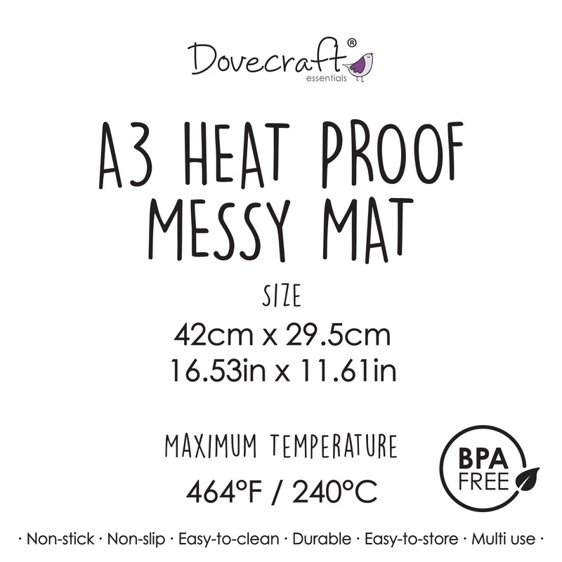 - ★ A3 size ★ Heat Proof Mat in a great size for all kinds of techniques. Always making a crafty mess? You need the Dovecraft Essentials Heat Proof Messy Mat! Durable, long lasting and not slip, this is the ultimate craft companion.
