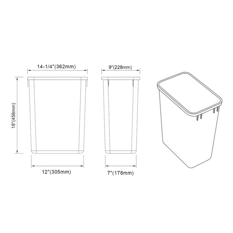 - MEASUREMENTS: The 35L container is 18" high with the top/opening dimensions of 14" deep x 9" wide and bottom/base dimensions of 12-1/4" deep x 7-1/4" wide.