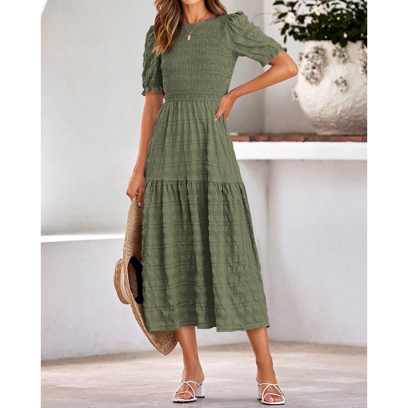 - ?Features: Woman Ruffle Sleeve Round Neck Casual Smocked Tiered Party Dress / Crew Neck / Short Puff Sleeve / Elastic Smocked Shirred Bust / High Waisted / A-Line / Tiered Hem / Loose Fit / Not See Through / Elegant Cute Stylish / Button End At Back / Solid Color / About Ankle Length / Flowy Swing Bohemian Dress / S=US 4-6, M=US 8-10, L=US 12-14, XL=US 16-18