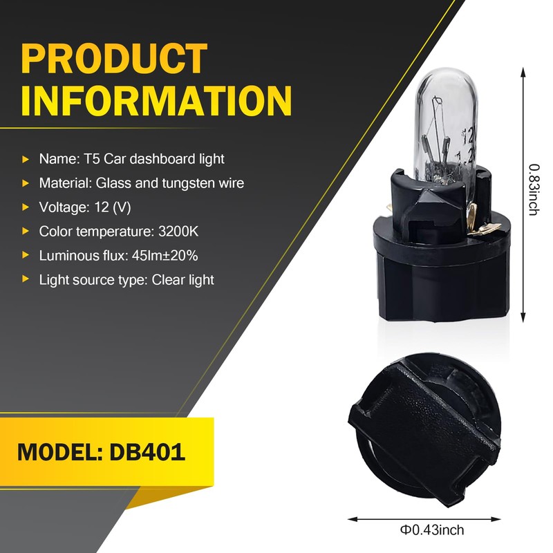 Package Included: After purchase, you will receive a pack of five DB401 T5 12 V 1.2 W dashboard lights with black base.