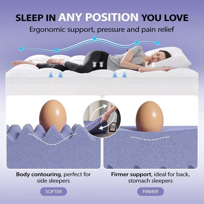 - 5 INCH ULTRA THICK DESIGN: downluxe 2-in-1 dual-layer construction twin xl mattress topper features a 3-inch gel-infused egg crate memory foam for cooling comfort and lasting support and a plush 2-inch pillow top for cloud-like softness. This innovative design cradles your shoulders, neck, back and spine, helping to alleviate pain and promote a more restful sleep