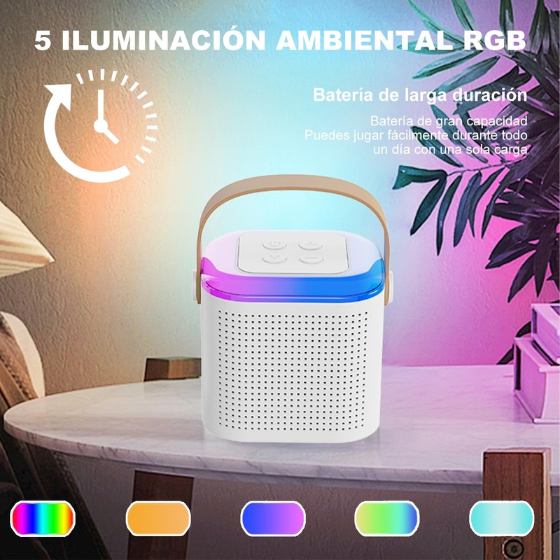 - Bocina karaoke, una variedad de cambios de voz interesantes, lindos y divertidos, estándar, diosa, dios masculino, voz de bebé, voz mágica múltiples cambios de voz, cambio de un clic, las luces LED bailan al ritmo de la música, creando un ambiente alegre para fiestas en casa, aulas, discursos y muchas otras ocasiones.