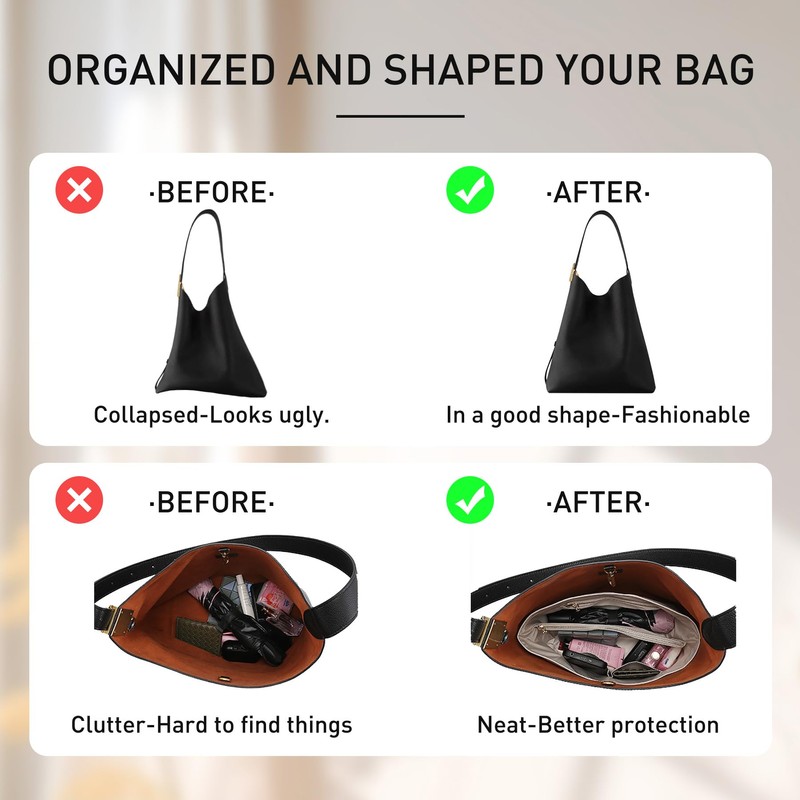• Maximized Organization & Bag Protection: 17 Practical Pockets cleverly designed pockets keep essentials (phone, wallet, keys, makeup) neatly sorted and easily accessible within your luxury bag, and shields your bag's delicate interior lining from scratches by keys, jewelry, or hard items. Gently maintains the bag's structure without rigid inserts