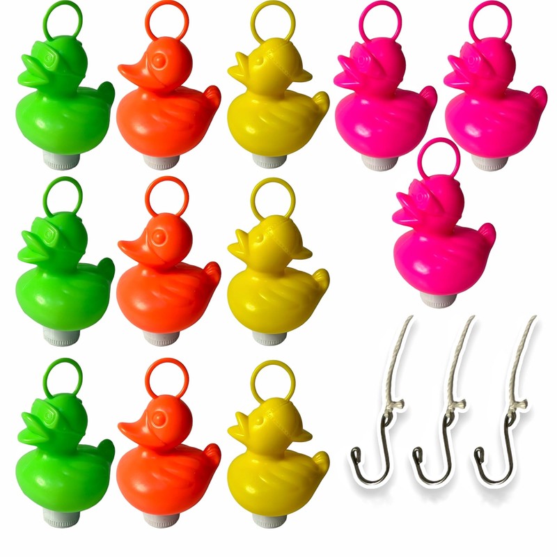 - Enjoy a fun fishing game with 12 colourful plastic ducks with hooks and weight, which can float in the water and be caught with the 3 included hooks