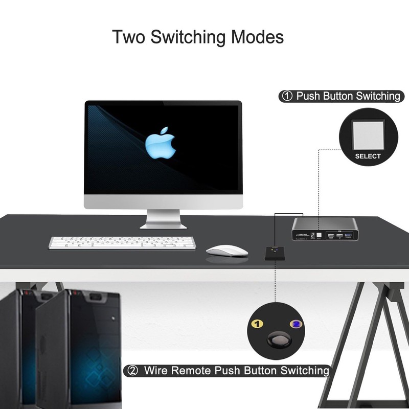 - DP KVM Switch - The 2-Port HDMI KVM Switch enables two DP-equipped PCs to share 1 DP monitor, a keyboard, and mouse, facilitating effortless switching between systems. It helps declutter your workspace and maintain a neat, organized environment.