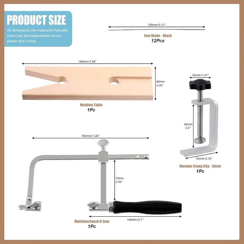 - [You will get]: You will receive a saw frame combination kit for 14 jewelry dealers.Including 1 adjustable jewelry saw frame and 12 blade, and a V -shaped groove set for the wooden jewelry folding tool for the workbench, a total of 14 useful tools to use.