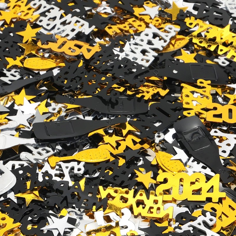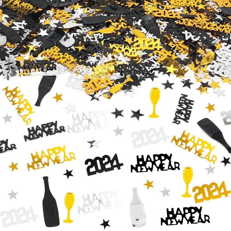 - Package includes: this shiny mass of black and gold nye confetti 2023 is a guarantee for an endless effect. Many pieces of Happy New Year confetti decorations with different colours and shapes in the pack, total 45 g, lightweight, shiny to meet your decoration needs.