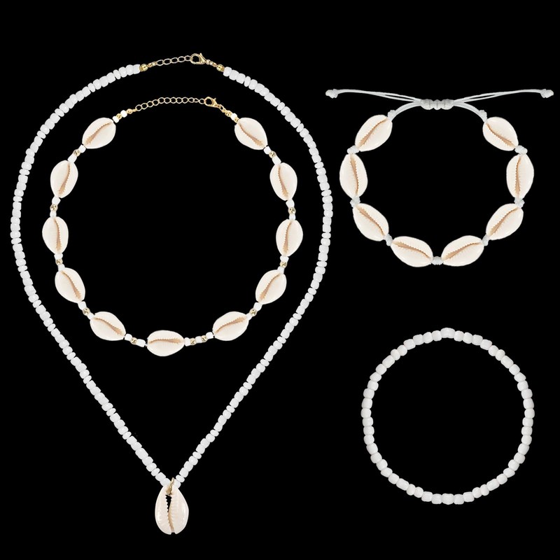- Shell chain bracelet set: the boho jewellery set consists of a white shell chain, a shell choker, a shell bracelet and a white pearl bracelet and is the perfect summer beach accessory for women.