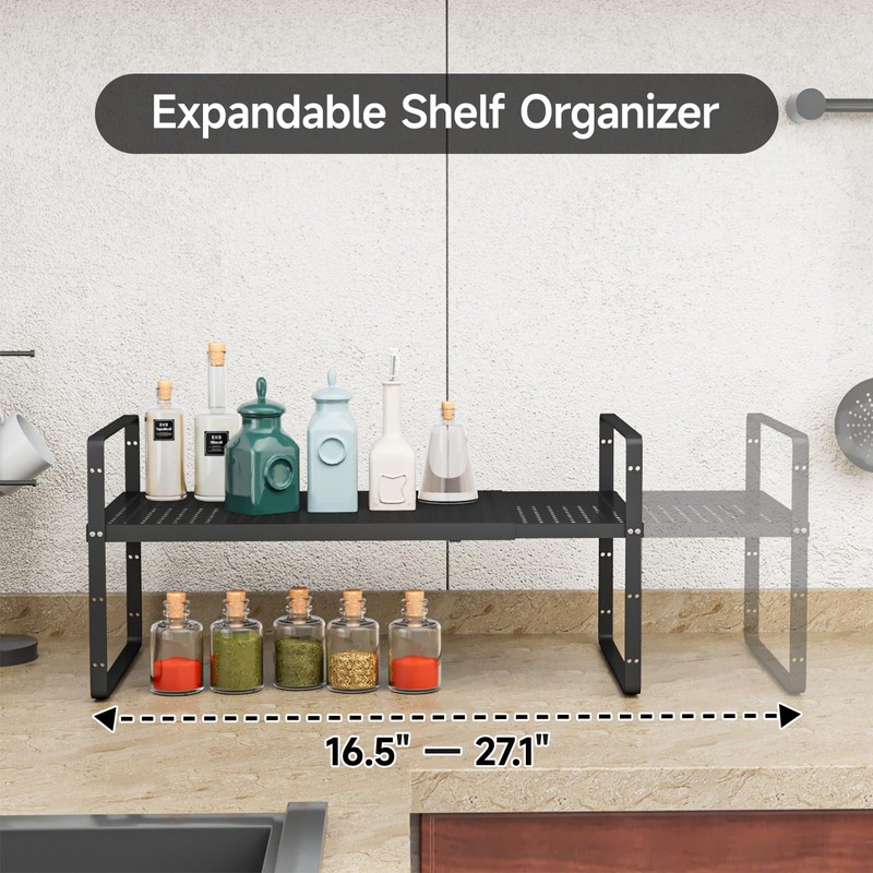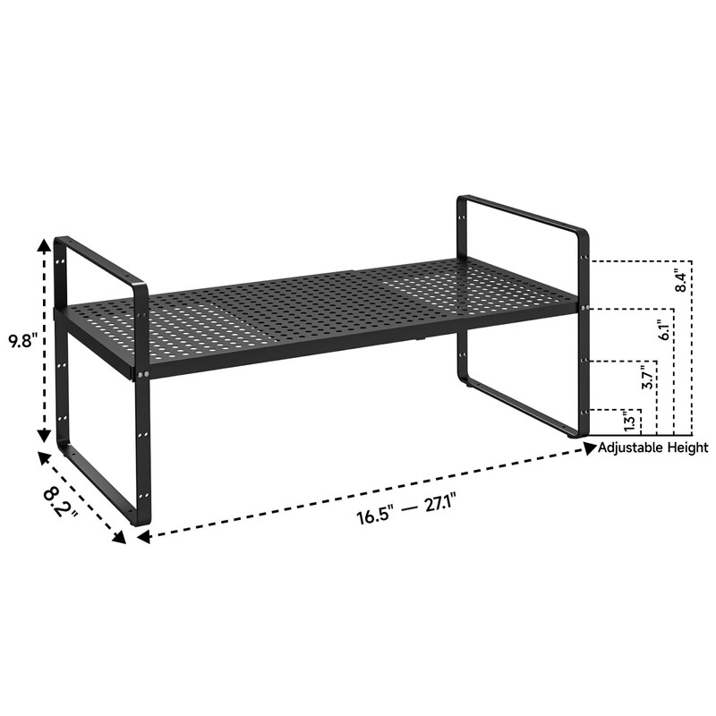 - Expandable Length& Adjustable Height Countertop Organizer: The kitchen countertop shelf of size is: (16.5’’-27’’)L * 8"W * 9.6"H. The length of this kitchen shelf can be adjusted from 16.5 to 27 inches and adjust shelf height from 3.9 to 8.7 to fit your storage needs just about anywhere, according to your needs