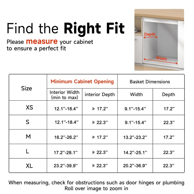 • Easy to Install: The slide out drawer is side-mounted. Follow the installation instructions step by step, measure the size of your cabinet and then hit the screws can be done easily. Please choose the size you need before you buy, please note that first measure the size of your cabinet before you buy, to avoid the trouble of return, It can fit in cabinets with a width of 12.1’’ to 18.4’’ and a depth of 22.3"