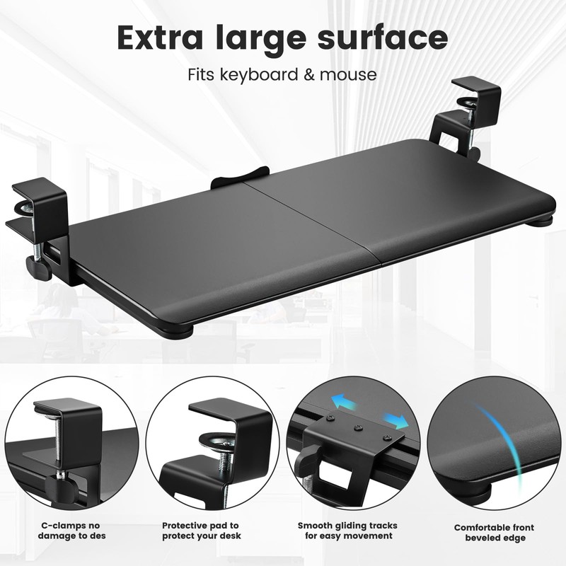 Sturdy C-Clamps Easily install your keyboard by C-clamps, which hold everything tightly in place and are easily adjustable for user convenience. Keyboard Tray Under Desk Safety Lodge Stopper The safety lodge stopper prevents your keyboard from slipping backwards and potentially falling. Protective Sponge Pads The upper and lower sponge pads between C-clamp and your workstation helps to prevent against damages to your workstation, fully protecting your desk. Gliding Tracks The smooth gliding tracks offer you freedom to move to your desired location within the allowed range. Ergonomic Design for Wrist Rest The edge of the keyboard tray is designed to offer wrist/hand support for long periods of typing.