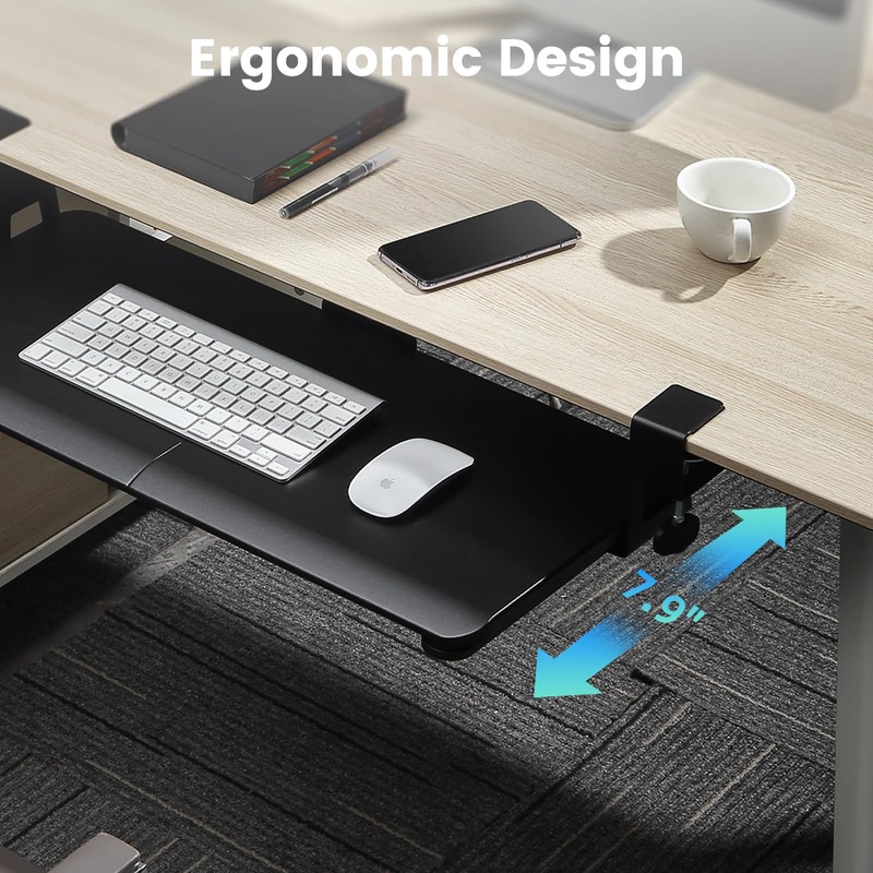 • 【Smooth Sliding Keyboard Tray】This under desk keyboard tray features a smooth pull-out mechanism using our ball slide-way system, preventing it from accidentally sliding out when fully hidden. The tray extends up to 7.9 inches from your desk edge, offering ample space for typing and mouse movement.