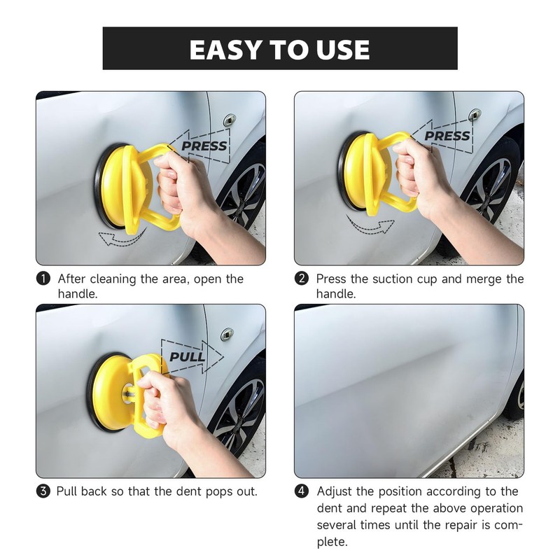 - EASY TO USE: Wipe away any water droplets and dust from the surface of the object. Then, place the dent puller suction cup on the dent, open the movable handle on one side, and press down on the suction cup (do not release until retracting the handle). Retract the handle and pull backward with force to complete the repair.