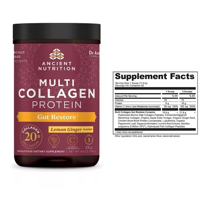 - EASY TO USE & PACKED WITH NUTRIENTS - One serving of Ancient Nutrition Multi Collagen Protein Gut Restore powder provides 9g of protein, 13.7g of gut restore collagen blend and 45 calories! Add a scoop to any smoothie, protein shake, tea, coffee or your favorite drink for a daily boost of collagen protein and gut support.