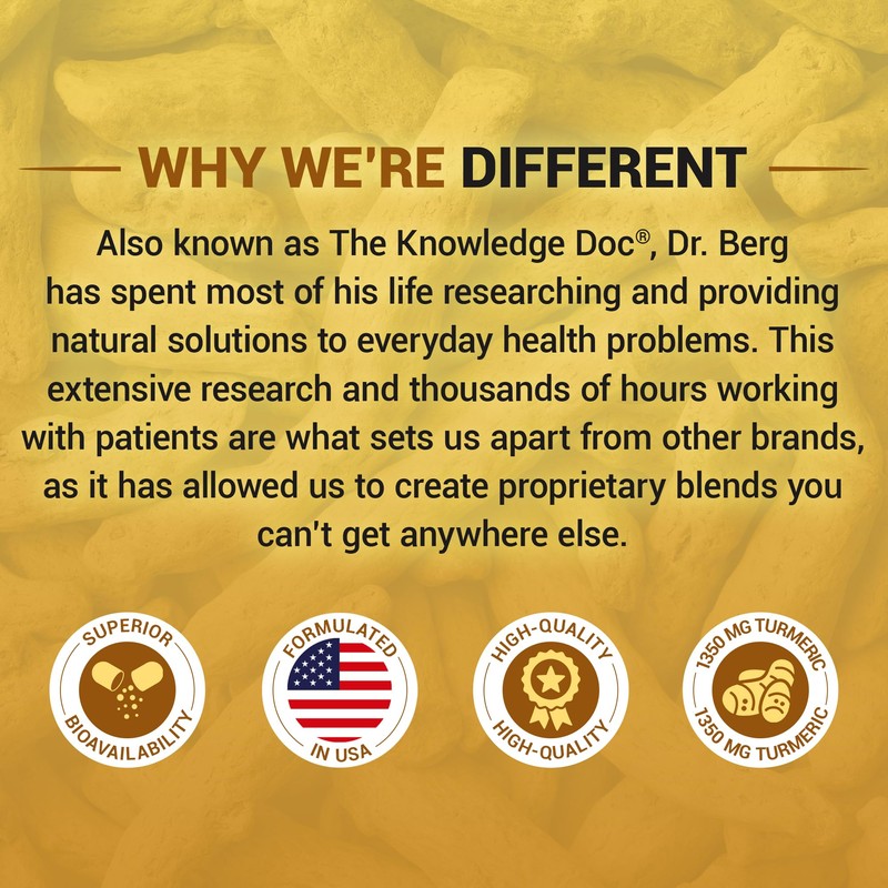 - C Dr. Berg has cultivated millions of followers across multiple social media platforms by providing educational health content and easy-to-follow natural remedies to everyday health problems. His knowledge of the body and what it needs is extensive and translates to his high-quality products like our Turmeric Curcumin with BioPerine. His care for ingredients is what separates Dr. Berg's products from others.