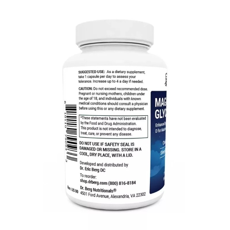 Dr. Berg Magnesium Glycinate is an exclusive combination of high-quality ingredients that provides a daily dose of essential nutrients. Each capsule delivers 120 mg of magnesium, 6.5 mg of vitamin B6, 100 IU of vitamin D3, and 10 mg of zinc.