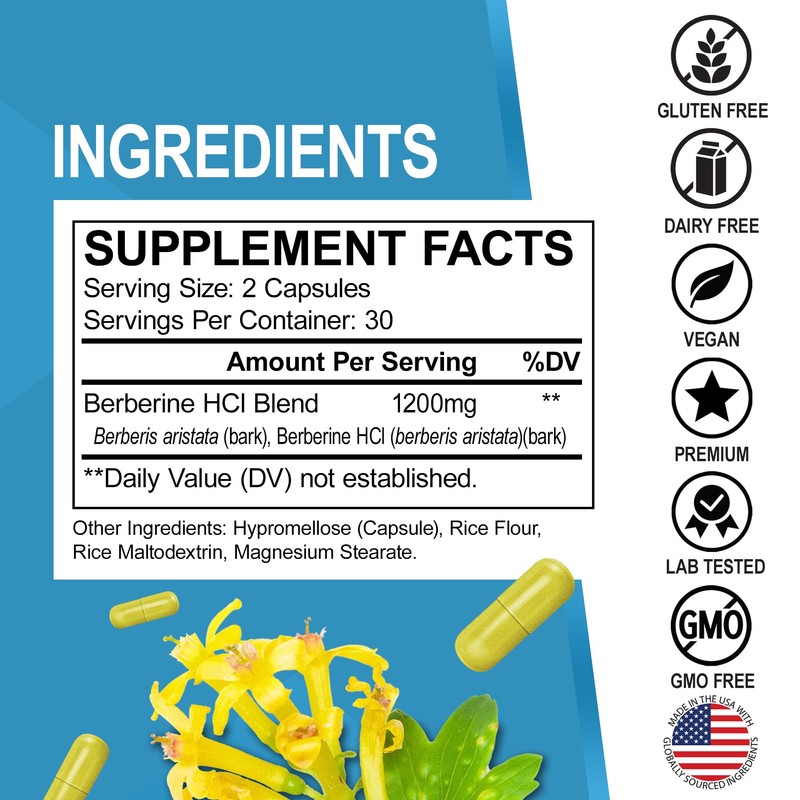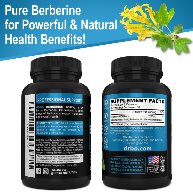 - Natural Berberine Supplement: Our easy to swallow Berberine HCl Supplement is the highest quality plus has a powerful 1200mg per serving; berberine for super healthy metabolic support
