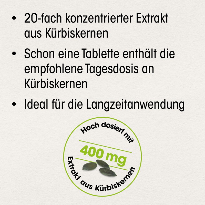 - MIT HOCHKONZENTRIERTEM KÜRBISKERN-EXTRAKT: Die Tabletten enthalten einen hochkonzentrierten Extrakt aus Kürbiskernen (400 mg), der zu einem normalen Harnfluss beiträgt