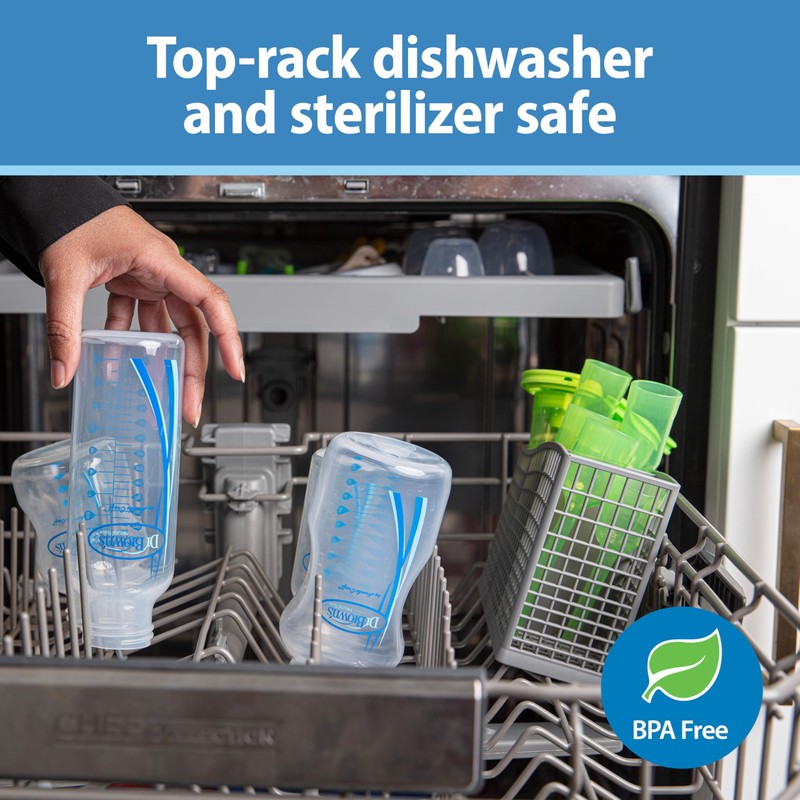 - DISHWASHER SAFE. Safe for use in dishwasher (top rack only), electric and microwave sterilizers or boiling water. BPA Free.