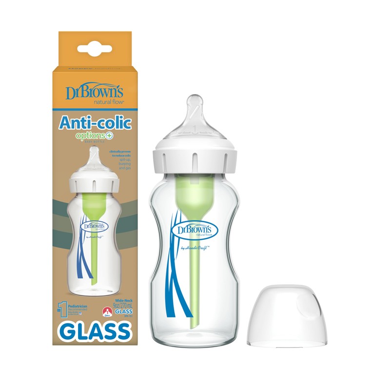 - Dr. Brown’s Natural Flow Anti-Colic Options+ Wide-Neck Glass Baby Bottle 9 oz/270 mL, with Level 1 Slow Flow Nipple, 1 Pack, 0m+