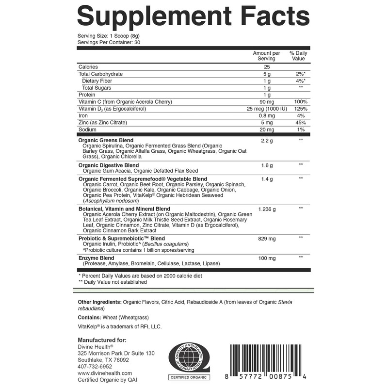 - Green Supremefood contains 10 Organic Fermented Vegetables and 4 Organic Fermented Grasses