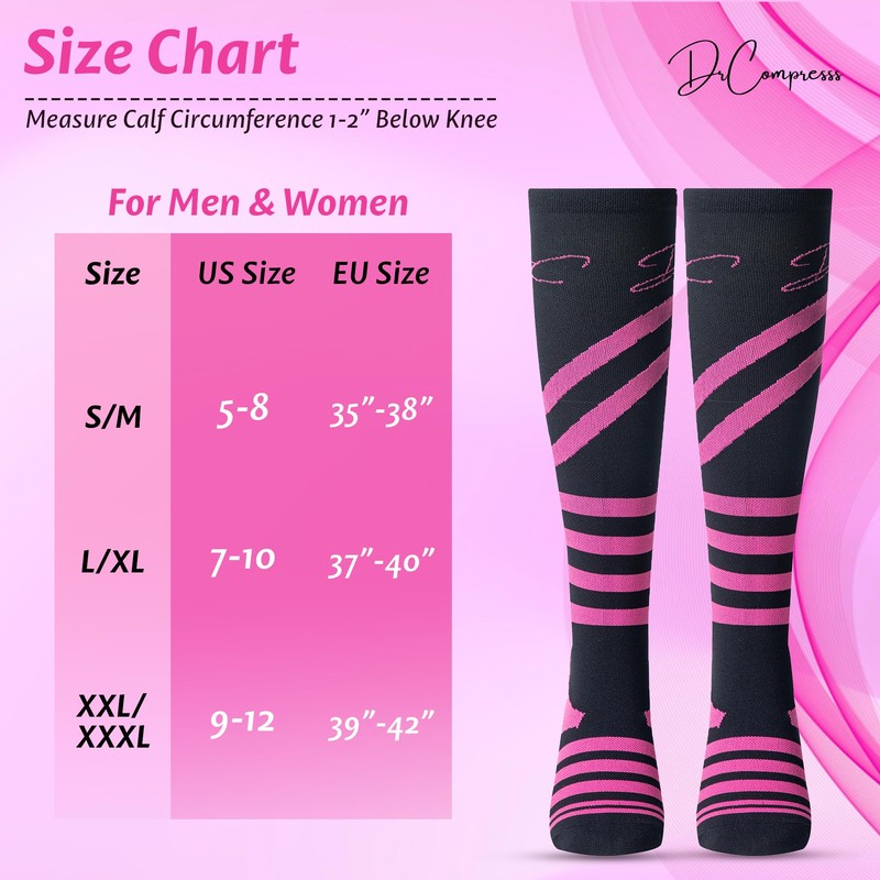 - ✅HIGHEST QUALITY KNEE-HIGH COMPRESSION SOCKS: Dr. Compresss compression socks are recommended and preferred by individuals. The reinforced, cushioned heel and toe support provide unmatched comfort. Designed to offer premium support, comfort, and relief without compromising mobility, the form-fitting, lightweight, and breathable fabric maintains joint stability during any activity.