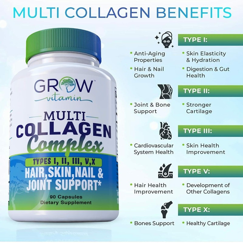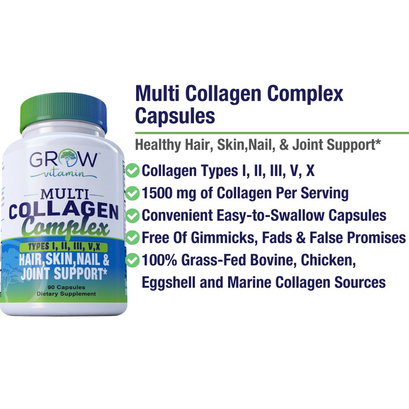 Grow Vitamin Multi Collagen capsules offer the power of 5 types of collagen in convenient, easy-to-swallow capsules, providing health benefits for your hair, skin, nails, and joints every day. With collagen types I, II, III, V, and X, Grow Vitamin Collagen is designed to boost your body’s collagen levels, help you more efficiently use the collagen you have, and support the body’s natural collagen production.*