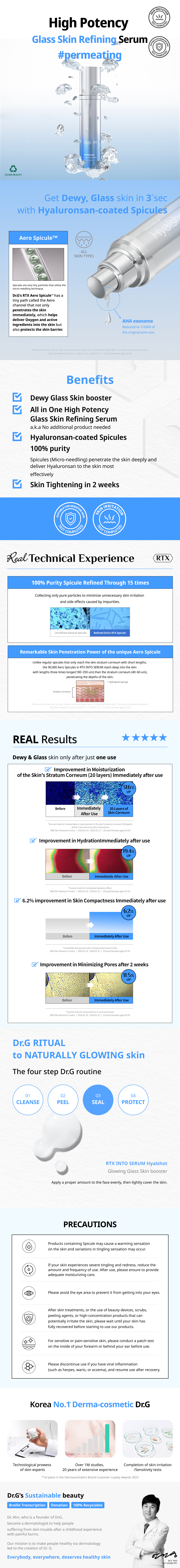 The 900,000 spicules deeply penetrate into skin in just 3 seconds to provide instant changes in skin. The 100% pure spicule containing pure particles made with 15 times of refining minimizes unnecessary skin irritation and side effects that are caused by impurities, and the low level of stimulation helps with providing instant skin improvement. Completed clinical trial for sensitive skin types and skin irritation test. The 900,000 aero-spicules reach deep inside skin by having triple longer length than stratum corneum. Helps with improving hydration of stratum corneum, skin moisturizing, outer skin density, and pore area right after use.