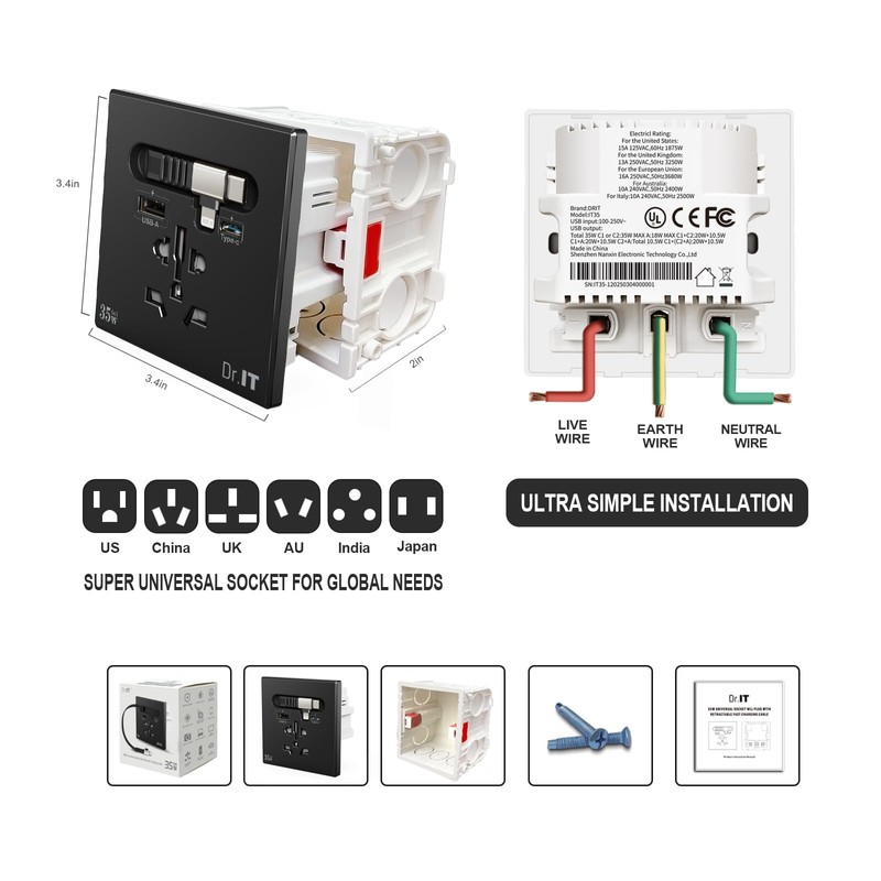 DR.IT Universal Adapter, USB-A & Type-C Charging Socket, 35W Fast Charging, Multi-Country Compatibility, Built-in Safety Features, 15A/120V (Black)