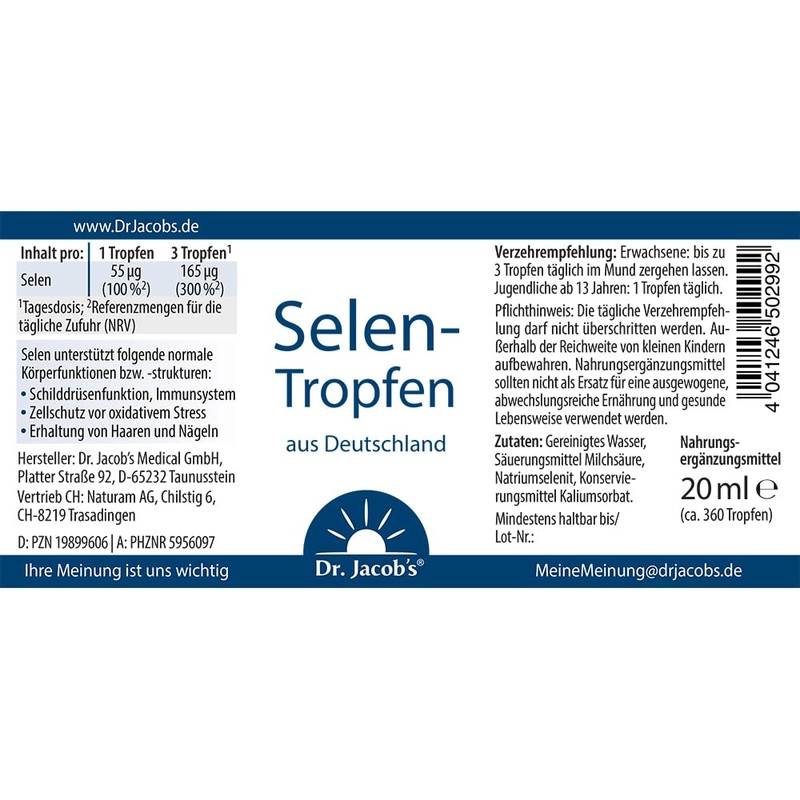 Dr. Jacob’s Selen-Tropfen I ca. 360 Tropfen à 55 µg I Reines Selenit aus Deutschland I Lebenswichtiges Spurenelement I Für Immunsystem, Zellschutz & Schilddrüse* I 20 ml