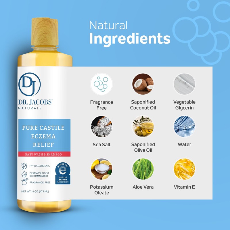 Dr. Jacobs Pure Castile Baby Wash for Eczema Relief, Effective Body Wash to Relieve Baby Eczema, Gentle Baby Shampoo, Unscented Soap for Baby's Sensitive Skin, and Hypoallergenic Baby Care (16 oz-2PK)