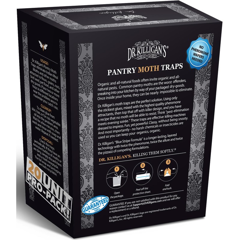 • Dr. Killigan's Has Served More Than 1 Million Households  Don't settle for poorly made imitations, or the generic and outdated alternatives that just don't work. An incredibly effective moth killer, Dr. Killigan's Pantry Moth Traps is a highly trusted solution among households, pest management professionals, national food suppliers and home improvement experts.