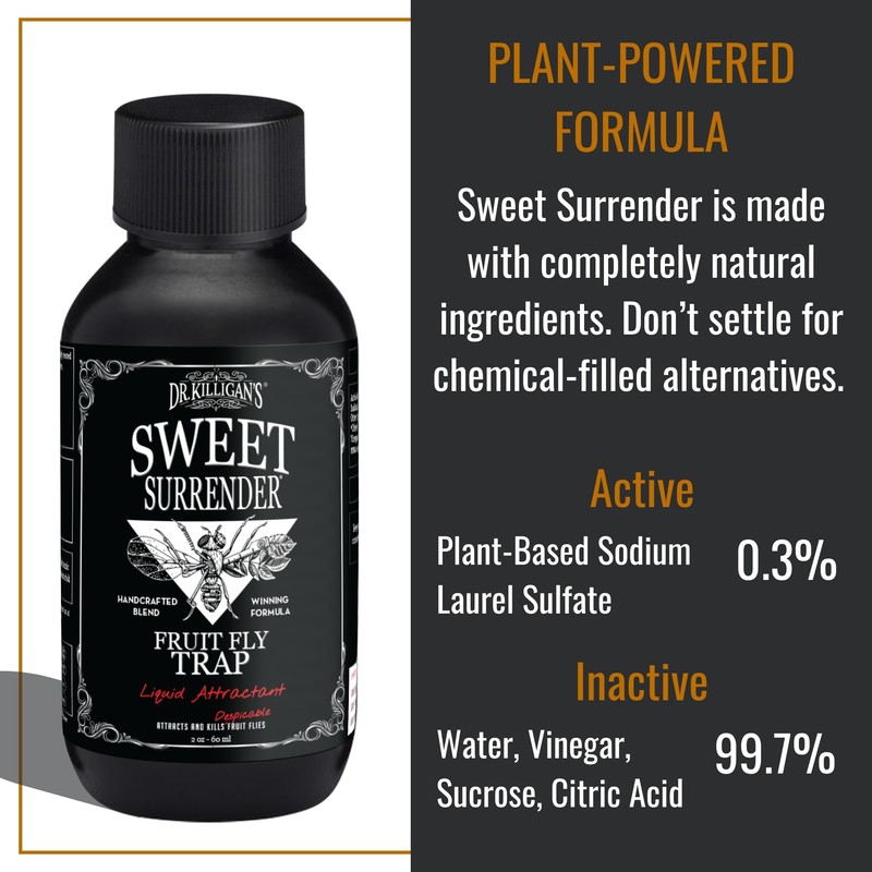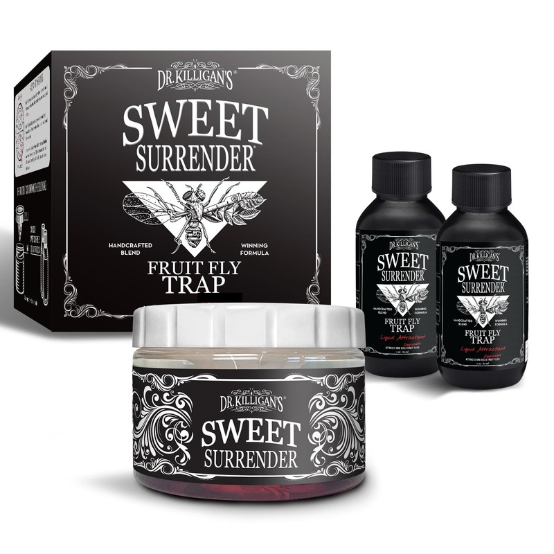 - Reusable Trap with Long-Lasting Attractant: Each fruit fly catcher includes two 2 oz. bottles of Dr. Killigan’s fruit fly lure, providing up to 60 days of fruit fly bait. As a reusable trap with the option for 16 oz. Sweet Surrender liquid refills sold separately, this durable multi-use solution eliminates the need for wasteful single-use traps.