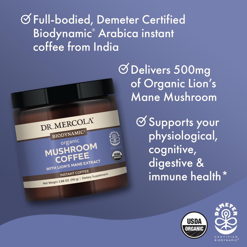 - The first-ever Demeter Certified Biodynamic mushroom coffee blend, our Biodynamic Organic Mushroom Coffee with Lion's Mane (Hericium erinaceus) Extract supplies 500 mg of Organic Lion's Mane Mushroom Fruitbody Extract, yielding 90 mg of valuable Beta Glucans per serving