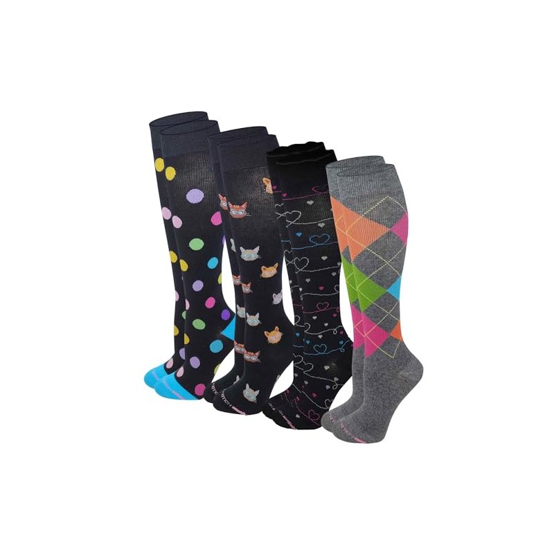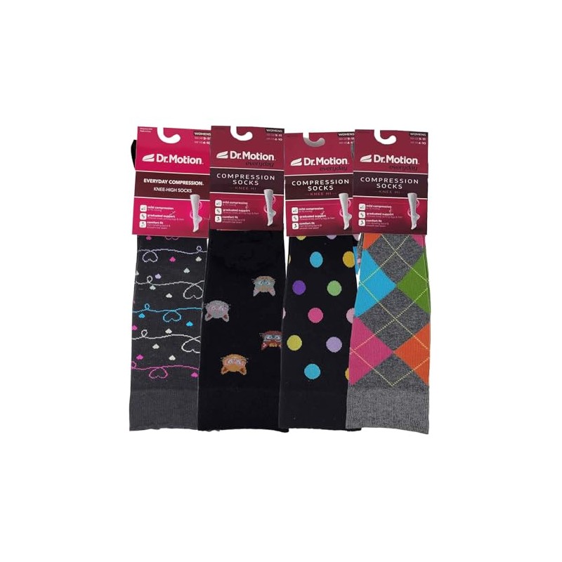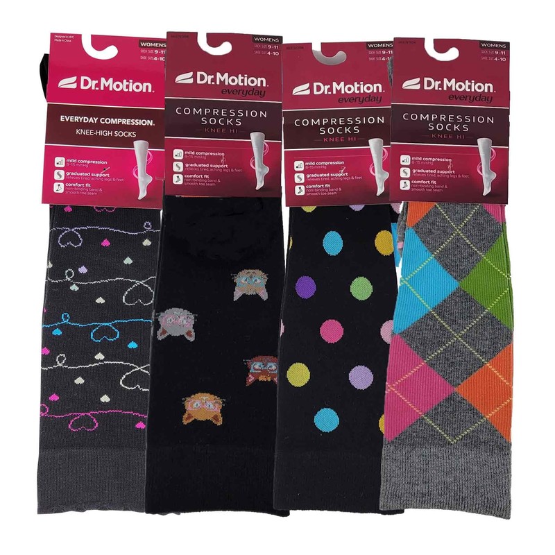 Dr. Motion Compression Knee High Socks for Women - 4 Pairs Pack (US, Numeric, 9, 11, Regular, Regular, Assorted #6)