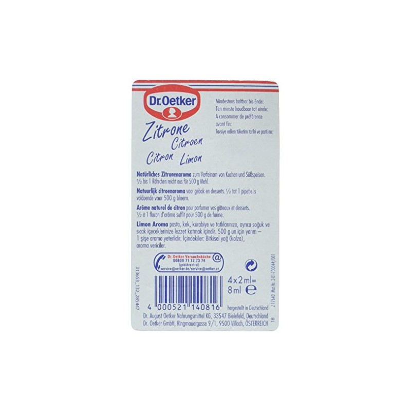 - Contents: 1 x pack of 4 Dr. Oetker natural lemon aroma (2 ml per tube), lemon aroma concentrate