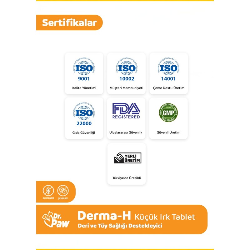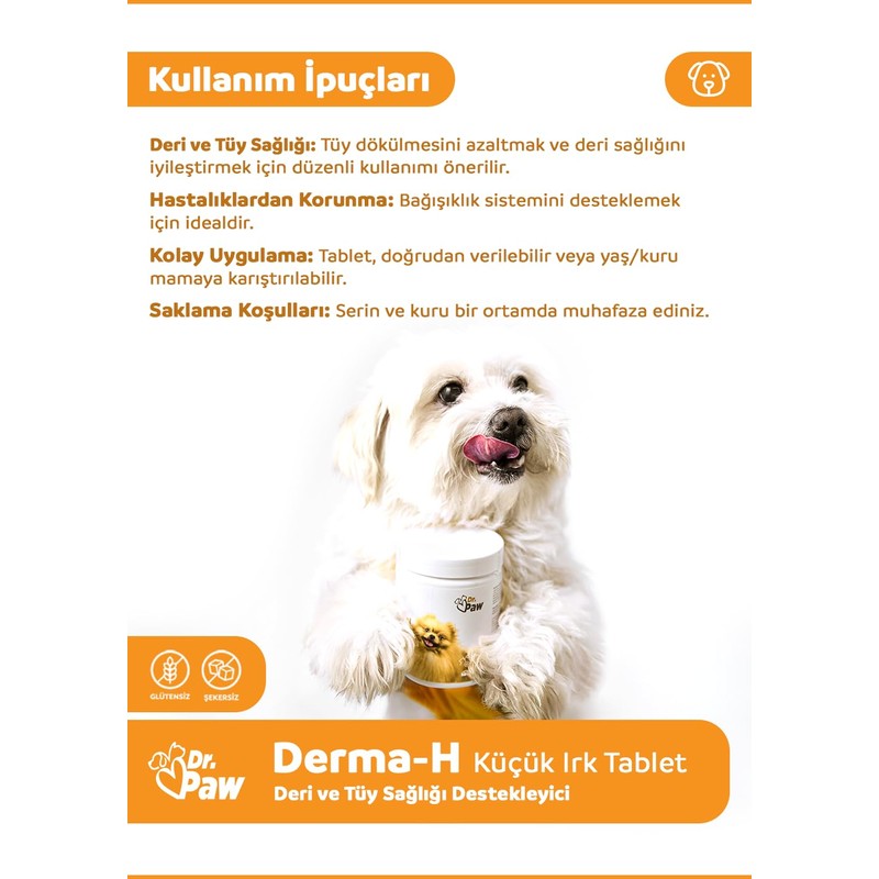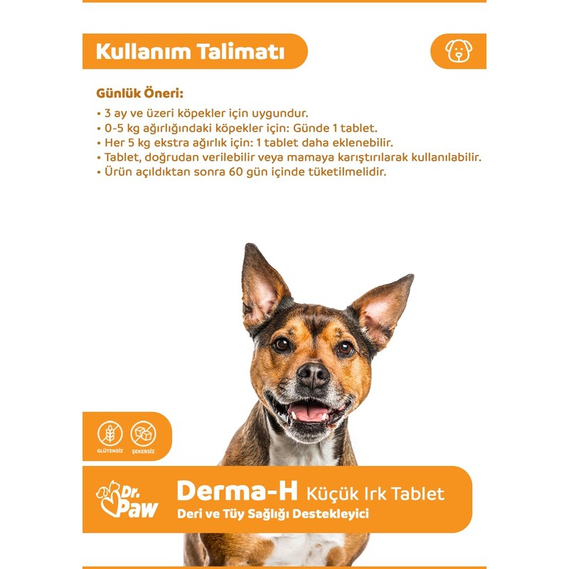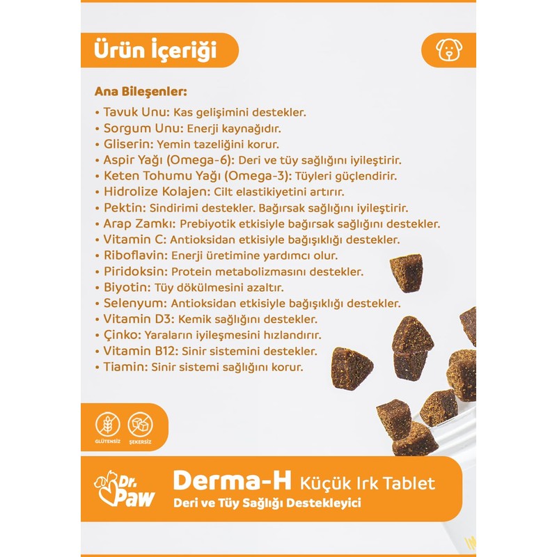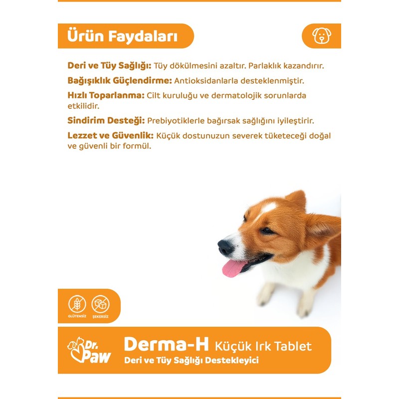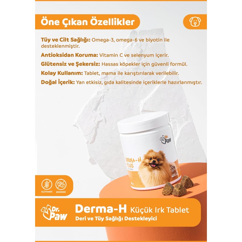 Dr. Paw - Derma H Plus Küçük Irk Köpekler için Glütensiz ve Şekersiz Tüy ve Cilt Sağlığı Destekleyici Çiğnenebilir Tablet (60 Adet, 90 Gr)
