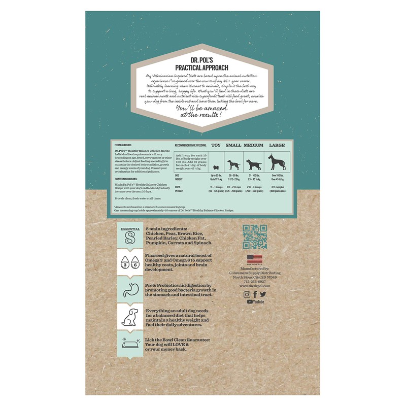 **Nutrition Statement** Dr. Pol’s Healthy Balance Chicken Recipe for All Breeds and Ages of Dogs is formulated to meet the nutritional levels established by the AAFCO Dog Food Nutrient Profiles for all life stages including growth of large size dogs (70 lb. or more as an adult).
