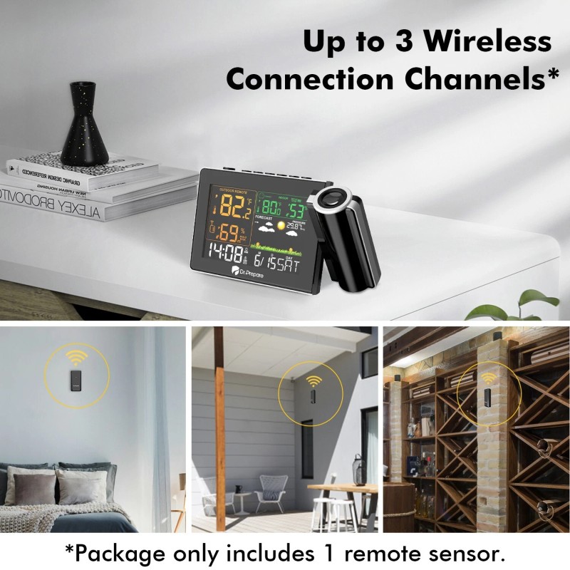 Wireless Remote Sensor· Channel button (channel 1, 2, or 3) · Wall-mount design · Splash resistant (avoid direct sunlight or rain) Note: · Concrete walls, cellars, metal doors, and other sources of signals will interfere with transmission. · Please ensure the wireless range between the alarm clock and the sensor is within 200 feet. | Indoor Comfort IndicatorsThis projection clock measures indoor temperature and humidity and displays the comfort level, protecting your whole family get rid of troubles caused by excessive dryness or humidity. | Dual AlarmsComes with separate switches on the back to control two alarms for different schedules and plans. Dr. Prepare projection alarm clock allows you to work and relax on schedule. |