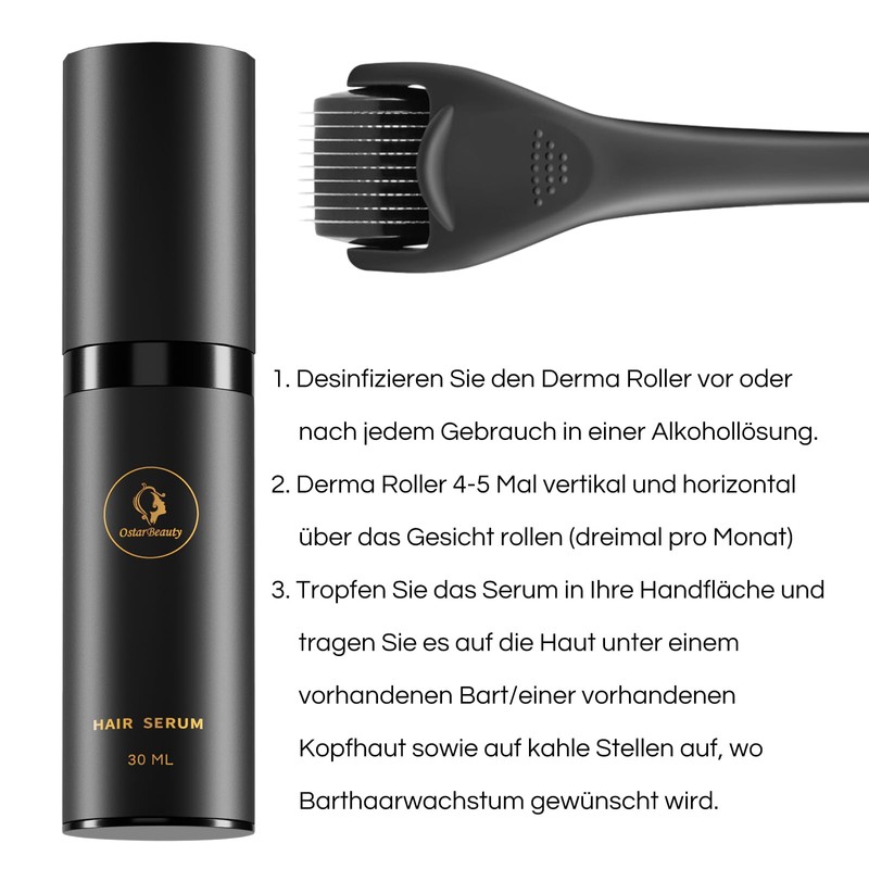 • Easy operation and consistent use: 1. Microneedling (3 treatments per month are recommended, use Dr.roller Derma Roller) 2. Manual massage (apply serum to the scalp/beard area and massage once a week).