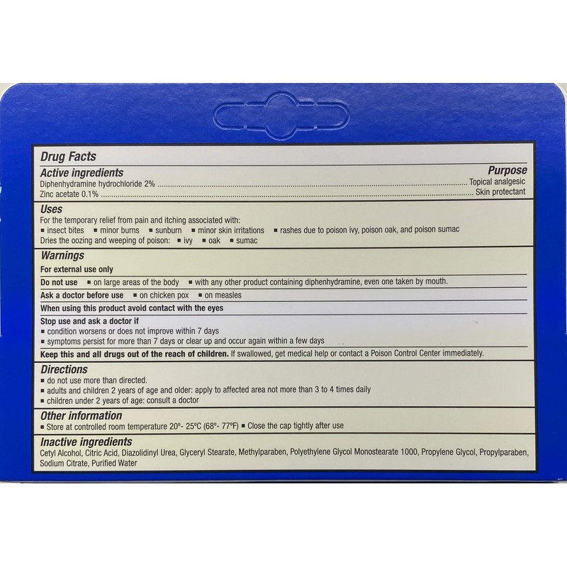 - CONTAINS: Diphenhydramine HCl 2%, topical analgesic; Zinc acetate 0.1%, skin protectant